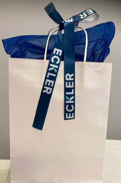 Attractive two-toned ribbed webbed handleSize 13” W x 8.5” H x 6.5” D